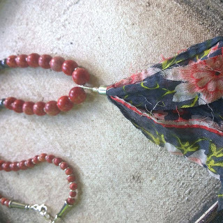 Making tassels is an assembly line process. The scraps are four layers thick and quilted together. I have to pull the layers apart and pull out the loose threads. Next they are sorted by color. This is when they start “talking” to me. Colors or patterns will grab my eye. Wire wraps are more mathematical. And what people are calling my “Spirit Necklaces”, are all intuition. For those I need a little quiet and to just step out of the way so the design can just become.