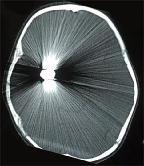 Sometimes there is an accidental beauty in the most macabre of events. Having a bullet lodged in your brain can produce beautiful CT scans due to the scanner’s difficulty with imaging metal objects.