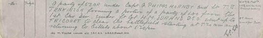 The 'dismounted party' in my grandfather's account - later that year to be formalised as the regimental Pioneer Company, part of the Divisional Pioneer Battalion - was organised at the Divisional level, and included officers and men from all of the constituent cavalry regiments who might be assigned for a long period or relieved and replaced as circumstances dictated. Among other work, the grim task of battlefield clearance fell to the dismounted parties of the 1st Cavalry Division from early July. The participation of the 9th Lancers in this work can be reconstructed from the regimental War Diary and the regimental history, The Ninth Queen’s Royal Lancers, 1715-1936, by Major E.W. Sheppard (Gale and Polden, 1939), which contains eyewitness accounts not available elsewhere. The bodies of many of the infantrymen killed in the first waves of he offensive remained on the battlefield for days afterwards, and in the heat of that July the consequences can be imagined. On 4 July, the 9th Lancers party – ghoulishly called a ‘vulture party’ by one of the officers – moved forward to help clear the Fricourt area of the battlefield, where there had been over 8,000 British casualties. The entry below from the 9th Lancers War Diary shows that the party comprised two officers and 63 other ranks, part of a Divisional detail of 600 men, and was at work that day from dawn until early evening: