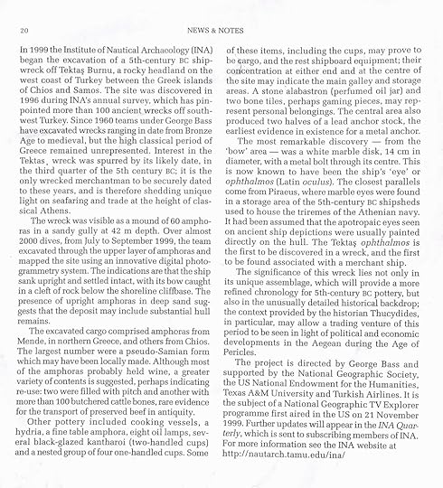 I wrote this article for the 2000 edition of the journal Antiquity, following the first season of excavation by the Institute of Nautical Archaeology (INA) of a classical Greek shipwreck off the west coast of Turkey at Tektas Burnu. I was very fortunate to participate in both the 1999 and the 2000 season at this site, carrying out more than a hundred dives to 45 metres and excavating some wonderful artefacts - including intact painted Greek vases of the 5th century BC. At the time I was still working in my academic teaching job in Britain, and was also an Adjunct Professor of INA. Since then much post-excavation work and further publication has been completed on the site, including a National Geographic article and TV feature and a detailed report by Deborah Carlson in the 2003 volume of The American Journal of Archaeology. You can read more about the wreck and see many superb images of the excavation work on the INA website. Artefacts from the wreck are displayed in the Bodrum Museum of Underwater Archaeology.