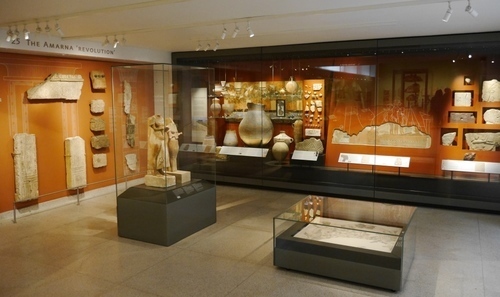 The paintings below are from a plaster pavement showing wild geese taking flight from a marsh, a wall-painting depicting a shrike on a papyrus stem, and the so-called ‘Princesses Fresco’, a fragment of wall-painting showing two daughters of Akhenaten and Nefertiti seated with their parents, their images now lost. The fourth photo shows fragments of faience and glass ornaments, products of a thriving industry at el-Amarna used to decorate royal dwellings and private houses.