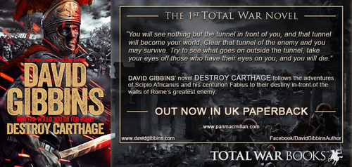 The UK paperback publication of the first Total War Rome novel, DESTROY CARTHAGE.