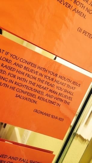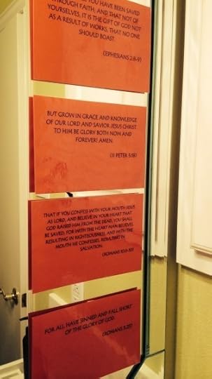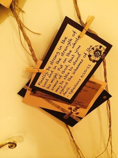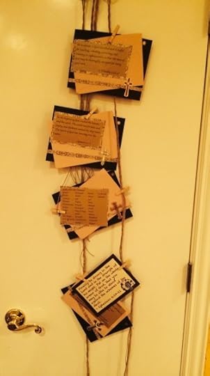 We hang some verses on our pantry door. Just clip them onto some rope with clothespins. (I think I'm going to start making the boys quote something before they can gain entry.) I don't change them out as often as I'd like to. These have been here for the past couple months. I've gotta do better. LOL
