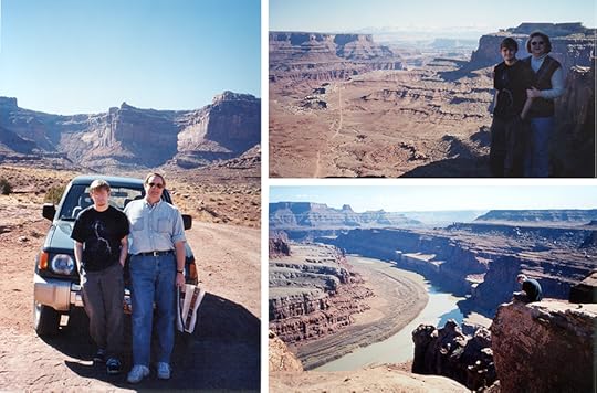 After taking a paid tour through part of Canyonlands once, many, many years ago, we were excited and impressed by the backcountry of this Utah national park that almost no one ever gets to see. So we bought a four-wheel drive vehicle in order to journey down these less traveled roads for ourselves. I had spent some time traveling the backcountry with my father and a geologist friend of his, hunting for rocks and fossils, so I was no novice about the dangers of being far from civilization on roads that could scarcely be dignified with the term. Eventually we ended back in Canyonlands and one fall day after we established ourselves at a motel in Moab, we started out. This time our plan was to navigate the Shafer Trail, a narrow, dirt, uranium-mining road carved down the side of sheer cliffs and into the interior of the area before it became a national park. It was build during the uranium mining boom in the ‘50s and was now largely unused except by crazy backcountry tourists like us. After taking the paved road into the park we found the small marker sign pointing out the dirt track. Very soon we found ourselves driving under overhanging ledges of sandstone. After that was a series of excruciating switchbacks which took a bit of nerve and low gear to get safely down. There was a long, straight road over what is called the White Rim that led to the Colorado River and we pressed on eagerly. When we got to the river we were surprised and disappointed, the Colorado was still another 1,000 feet down! We sat on the rim, had lunch and considered our position. We were too far into the canyon to drive back up to the top and so decided to continue down more switchbacks and very rough roads to finally make it to the river. The problem with backcountry roads is that if you drive very fast, you risk damage to your tires, so slow and steady always wins out. (Remind me to talk about the two flat tires on Nine Mile Canyon road.) After many more miles of washboard roads we finally made it a potash mining operation along the Colorado River and thankfully found a paved road that brought us back to Moab, late, tired and hungry. All in all, the solitude and unbelievable grandeur of these wild places was always enough to keep calling us back again and again no matter how difficult the road was. (Below, we consult the map while on the White Rim. Rob and Lynne before we take the plunge and Rob sitting on the edge looking down on the Colorado River, and driving his concerned mother crazy.)