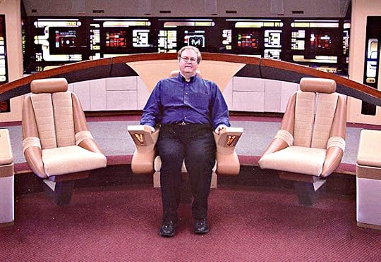 To say that Star Trek seriously impacted my life is an understatement. I would have never painted SF subjects, especially Trek. I did cartoon books, traveled to SF conventions all over the U.S. where I displayed and actually sold my art. I met incredibly talented artists and writers, editors, cartoonists and actors and a whole slew of fascinating people. I even started writing my own versions of exploring the universe in a series of novels. My mind was opened to the future possibilities of humanity, leaving our planet and exploring a vast and wondrous universe. I still believe in that future even though times lately have been a bit strained on our increasingly crowded planet. The desire to look ahead and imagine better things and then do them, is something that we will always need, Star Trek taught me that. (Below, me on the bridge of the Next Gen Enterprise, waiting to give the command to head out into space.)