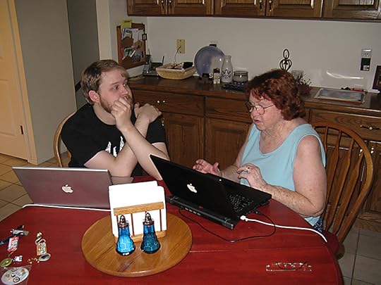 One of the great things about being a Star Trek fan is that you meet the very best people. Whether they are artists, writers, editors, actors or the rest, they have been by far the most intelligent set of people I have met in my lifetime. Bjo and John Trimble are prime examples of this. As science fiction fans from the beginnings of the 50’s, their accomplishments in fandom are legion. Bjo is noted especially for helping start a letter writing campaign that saved Star Trek from being canceled after the second season. The third season took the series into syndication and made it available to a wider audience and eventually rebirth as new movies and television series. I met Bjo at my first SF convention in Salt Lake and innocently asked her for an opinion on my early science fiction art. Bjo is a talented artist in her own right and proceeded to give me an unvarnished critique of my precious work. It is a tribute to my thick skin as an artist that I didn’t give up that day and decide to become a bank teller, but it was good for me to know where I stood and I learned much and was able to improve. Over the years we became pretty good friends and eventually close enough that they were comfortable with staying with us on their trips to visit relatives in Montana. When they visited they were kind enough to let us have some dinner parties where we would invite other friends, (and fans of Star Trek), to mingle one on one comfortably outside the hectic environments of conventions. One night Bjo complained that she was having difficulty with her laptop and our son, Rob, never one to be awestruck by famous people, proceeded to give her some assistance and advice on using the electronic beast. I had to smile, here it had come full-circle, Bjo instructing me in getting things done and now Rob, my son, instructing her in getting things done. Life is just too darn interesting when you mingle with Star Trek people. (Below, Rob and Bjo at the kitchen table.)