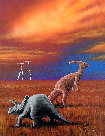 When the Catholic Inquisition in 1633 threatened Galileo with prison and torture, he was forced to renounce his discovery that the Earth revolved around the sun, (contrary to religions teachings at the time). He is reputed to have muttered under his breath, “and yet it moves.” So go ahead and shout it as much as you want, “Climate change is a hoax!” I will continue to say, “and yet it is getting hotter.” (Below is a very old painting of mine. Dinosaurs are thought to have flourished under a very long period of stable climate on Earth).
