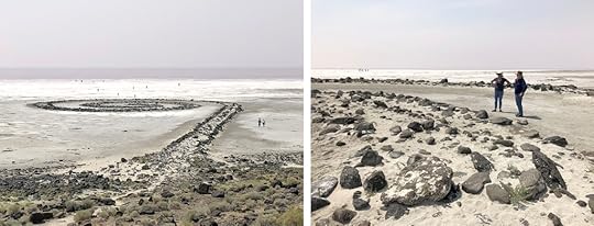 In 1970, an American artist, Robert Smithson built a large earthwork sculpture on the edge of the the Great Salt Lake in Utah. The Spiral Jetty forms a 1,500 foot-long, 15 foot-wide counterclockwise coil of rock, mud and salt. The work is located at Rozel Point on the northern shore of the Great Salt Lake, 31 miles south of the Golden Spike National Historical site. It can be reached by an occasionally rough dirt road. In this completely isolated area, there is no camping, water or facilities. You come, you look and you leave.