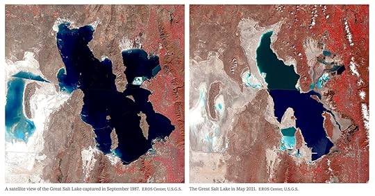 (Satellite photos from the U.S. Geologic Survey comparing the lake levels in 1987 when flooding was a danger, to 2021 where drying is now the danger.)