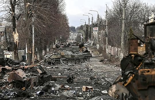 (Destroyed Russian military vehicles on a street in Bucha, a city west of Kyiv. Image courtesy CBC News.)