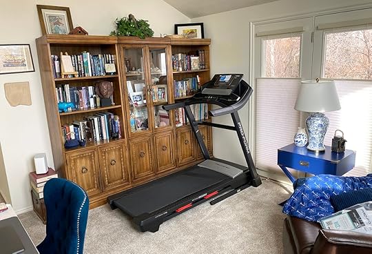 (The new treadmill in the library, big, ugly and in the way. I have invaded Lynne’s peaceful place of restful quiet. I wish there was another option.)