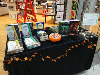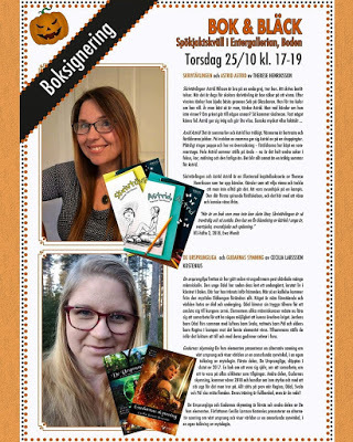 I torsdags var det stor spöljaktskväll med kvällsöppet i Boden. Ett jättekul initiativ som lockade många barn och vuxna. Det gick ut på att man fick en stadskarta med kontroller i form av spöken, och när man gått orienteringen, och hittat alla spöken, fick man spökbakelsefika på konditori Opalen.Under tiden som detta pågick karvades det pumpor för fullt alldeles intill bokhandeln Bok & Bläck där jag och Cecilia Larsson Kostenius hade vårt lilla signeringsbord.