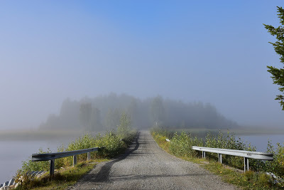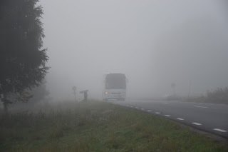 Rätt så inspirerande, och så där höstligt. Man kom att tänka på brittiska deckarserier, och dimhöljda hedar i berättelser av systrarna Brontë. Skolbussen dök upp ur dimman och tog Nissen med sig, och jag fick vänta med vovveprommisen tills det lättade.