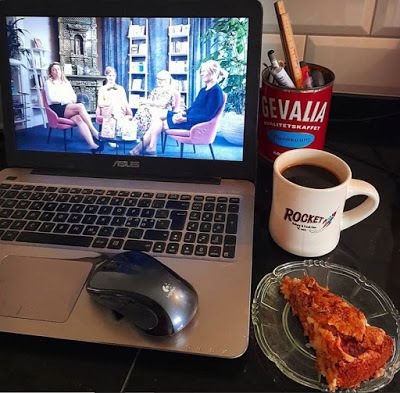 Starten p�� ��rets bokm��ssa i Mocktr��sktapppning blev ett trevligt k��kseminarie om h��gl��sning. (Viktigt, viktigt!) med fika best��ende av kaffe och nybakt. Pratade om sin syn p�� h��gl��sning gjorde Josefine Sundstr��m, Emma Karinsdotter och Maria Bj��rnsell. Det var ingen platsbrist vid k��ksb��nken som p�� riktiga bokm��ssan, och ist��llet f��r publikbrus, och ljud fr��n alla h��ll, hade jag ett par snarkande hundar som ljudeffekt. Senare p�� dagen s��g jag ytterligare ett par seninarier om barn och ungdomsb��cker. I morgon fredag finns fler bra programpunkter som jag ska f��rs��ka pricka in. L��ngtar tills det kan bli en fysisk m��ssa igen, ��ven om det h��r ocks�� ��r r��tt mysigt.