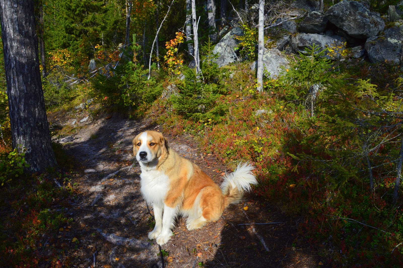 Det är ju så skönt med höst!Här är jag ute på prommis med Smulan.Suck! Tycks hon tänka. Ska du stanna Igen!?För jämt måste jag ju stanna och ta en bild. Eller äta lite bär, eller kolla en frusen fjäril, och sådant tar ju tid. :)