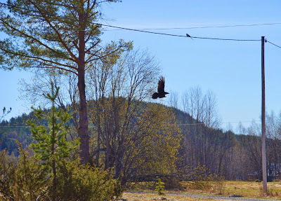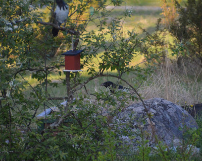 Å vad det är skönt att det äntligen grönskar. Det går så fort när det väl börjar. För bara en vecka sedan låg isen kvar på sjön och drivorna idikena. Men nu!Och Korp besöker mig med sin lilla fru då jag tar kaffet vid husknuten.De har bråda tider att samla mat till ungarna.På ledningen sitter en skata.Visst är det stor skillnad på deras storlek. :)