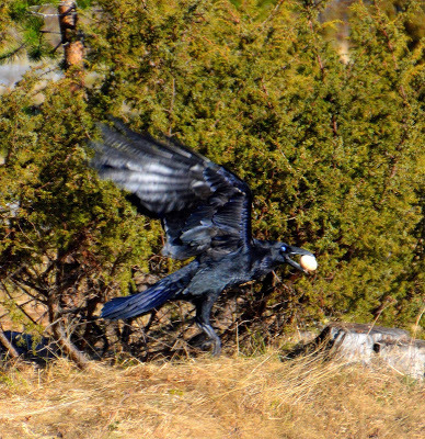 Det märks att fåglarna har ungar i sina bon nu. Lilla korpfrun är alldeles trasslig i stjärtfjädrarna och gnor dagarna i ända här förbi i jakt på mat. Kastar jag ut en halv smörgås eller något annat är de snart på besök. Först lilla frun, här på bilden, och sedan hennes storståtlige och skygge make. Han gömmer sig gärna bakom en buske. Men glömmer ibland sin jättenäbb, som sticker ut bakom kvistarna. Jag tycker förstås att det är kul att se dem, och de tycker att jag kan vara bra nog, fast bara om jag har något att bjuda på. Annars tycker de att jag kan hålla mig undan. Sitter jag i växthuset och skriver däremot kan de sätta sig i en tallgren ovanför och titta ner på mig.Har ni känt hur oerhört uttittad man kan bli av en fågel?Särskilt en korp. Ibland kan jag svära på att de kan känna på sig vad jag tänker.