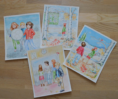 Ok, jag vet. Är helt kass på att uppdatera bloggen(arna). Har varit krasslig och är det fortfarande, fast om det är någon orsak vet jag inte. Man kan ju faktiskt ligga till sängs och blogga lite ifall man vill. Jag har målat lite istället. Har bestämt mig för att ta upp det igen, efter några års uppehåll. Ska göra bilderböcker har jag bestämt. Sedan får vi väl se om någon nappar på dem eller inte. Nissen har redan nappat, och tillsammans sitter vi och ritar och pratar om berättelser och vad som ska hända. I hans bok och i mina (Skissar på två olika.) Vi har också bestämt att göra en tillsammans om hur det är att ha en pappa som jobbar utomlands hela tiden, och hur det kan vara att resa bort och gå i skolan i ett annat land. Fast den har vi inte börjat skriva på ännu. Inte så mycket i alla fall. Men Nissen har skrivit lite stödord och ritat en bild av en flygplats.
