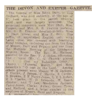 And for help with research about Edith Dart's life I'm especially grateful to  Keith Parsons (Researcher Crediton Museum); William (Bill) Jerman (Crediton Church); John Heal (Crediton Museum).