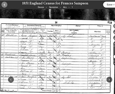 I've not yet have a chance to find out about Frances Gregory's family back in North Tawton where she was baptised. Gregory is a well-known longstanding North Tawton name and the family have for generations intermarried with branches of the Sampson family. I've concentrated on exploring Frances' life as mother following her marriage. In 1851 Frances Sampson, who I believe was mother of Jane Sampson (Edith Dart’s great grandmother and grandmother respectively) aged 86 is living (or staying?) at ‘Woodhouse’ farm with one of her sons and his family. Her husband, William from the Sampson ancestral line, must already have died. Aaron Sampson is I believe Frances’ youngest son from a family of 10-11 siblings; 58 years old, he is named as agricultural labourer. Wife Harriet and 4 children are named along with Frances, now not only a widow, but rather sadly, also labelled as ‘pauper’.