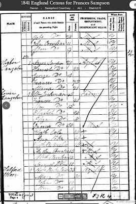 (If anyone coming across this is interested in the Sampson family of Broadwoodkelly and its links with Jane Sampson's ancestry) I've set out the possible ancestry on Tribal Pages. Just contact me for details.)