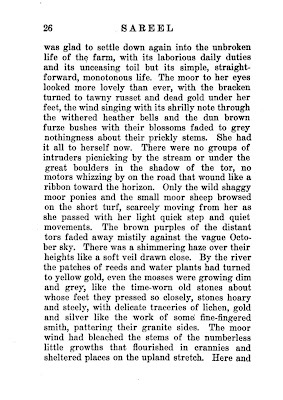 Sareel, the young girl heroine orphan in the novel, herself utterly immersed in the physicality of moor through her new home and work as farm servant, soon finds the local Genius loci has entered her very being. See for example the following page from the novel’s early chapters: