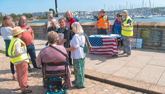 For all that, Americans for Action did well. The event didn’t attract a big crowd, but you wouldn’t expect that when the only advance publicity was an article in the local paper. We were still in the grip of a heatwave. Still some curious passers-by paused to listen, and others engaged with the
