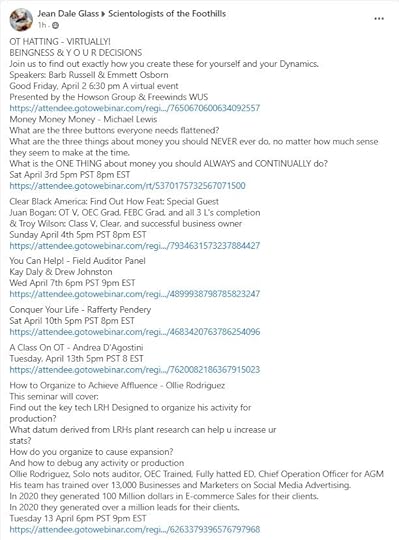 “There are currently three versions for the aplication of Scientology. 1. Anti ex-Scientologists (in our friends lists) applying reverse Scientology tech on USA (California and Democratic states). This is evolving fast into widespread implanting the likes of Gray ET underground/US military bases in the Western USA. 2. Church of Scientology applying a Marcabian version of Scientology (includes the Tax Compliance Offices in OSA). 3. And the standard application of Scientology in the Freezone.”