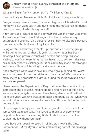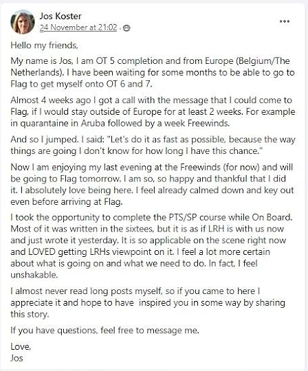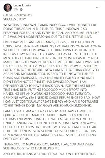 “All this talk about Scientology being some major sinkhole of money really makes little sense, especially in the FreeZone community. Even Church of Scientology costs are not that crazy, and they’re much higher than FreeZone. I’m not going to say Scientology is the only way people will become happier and better in their lives, but there is something valuable here. For $2,500 you could talk to a psych for about eight hours and then get a prescription for a bunch of meds which would just fuck you up more and make you feel less in control of your life. For $2,500 in the FreeZone you could most likely get to a point where your self confidence is restored and you start feeling in more control of your life. Honestly if after spending $2,500 you do not feel any more in control or confident in your life, LEAVE AND LOOK ELSEWHERE. Most of the people who complain about Scientology are those that got sucked into the culty parts and never really got far in it. It doesn’t take a lot of independent research to realize people like Chris Shelton don’t know a lot and he even admits it in his videos. He talks about classified materials, but his understanding is just what he got from watching South Park and skimming websites.”