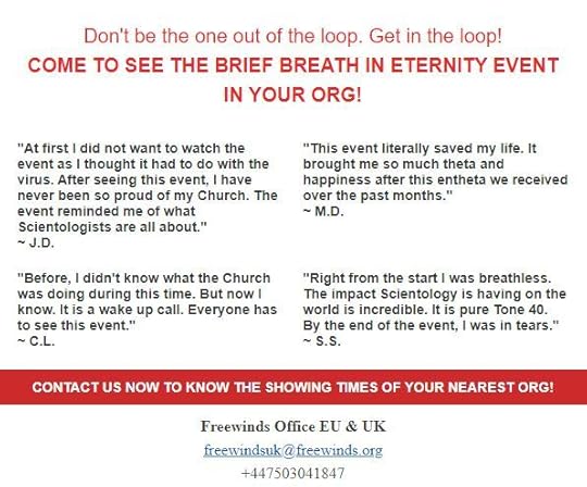 And imagine signing a billion-year contract in order to join Scientology’s war to take over the world, and you’re assigned to route in bodies for Comm Courses in places like central Ohio and Kansas City.