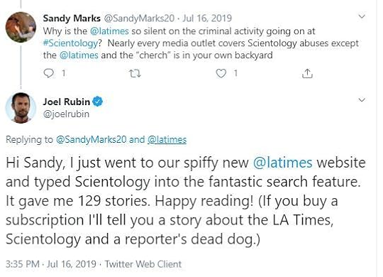 Rubin’s condescending response was so galling not only because he seemed unaware of what Sandy was talking about, but that he answered questions about the Times’ current lack of Scientology coverage by pointing her to heroic work Joel Sappell did thirty years ago.