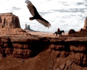 The shadow of the buzzard circling overhead fell over the cowboy’s hat, horse and saddle soaked with blood from the hole in his belly. He slumped in his stirrups. All around, the brutal Arizona desert faded into watery waves of heat. His gun was empty. He was out of bullets and almost out of blood. The vulture knew. It had been tailing him for hours. Just that one stupid bird. Waiting for him to die. Reminding him he would soon be dead. Real soon. His bloodshot eyes glared up at the ugly carrion bird, slowly circling. The man’s parched lips twisted in a defiant sneer. “Damn you, bird, you ain’t gonna get me!” The vulture didn’t answer, just circled. Then it disappeared from view. God, his stomach hurt. The cowboy looked around. Only endless desert badlands, scorching white sun and pounding oven heat. At least the bird was gone. He felt he had a chance again.