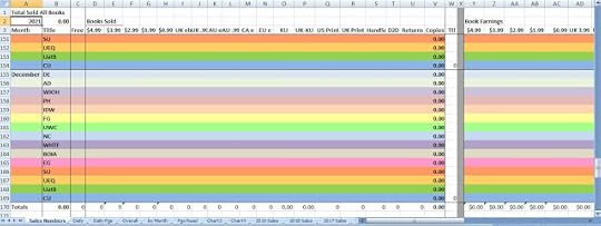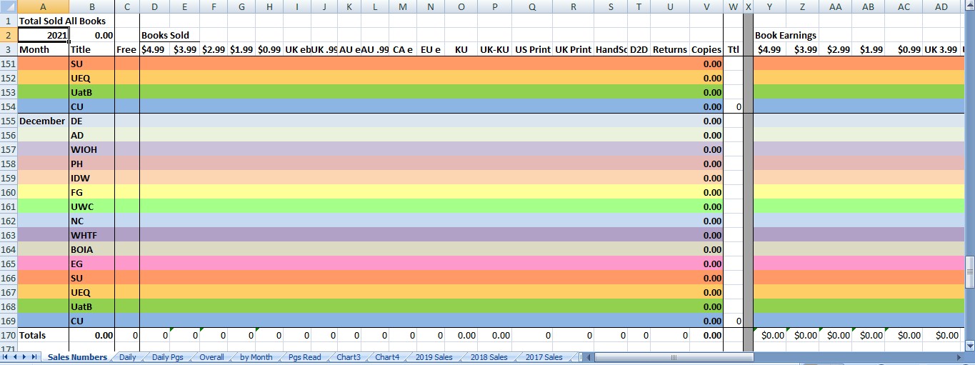 Book Sales Data has a tab for each month of the year and on each tab, it has sales information for each book - color coded by book on the rows with columns for each possible sales item. Each potential US price gets a column, other countries get columns (except the EU countries only have one column because they all use the euro), there are columns for KU and print and returns. This sheet is for quantities only. I used to do quantities and amounts, but I deleted the amounts section several years ago because it wasn't necessary here. I keep all that over in the Sales Totals spreadsheet.