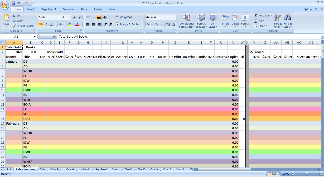 Anyway, the numbers go into Book Sales Data, which then feeds the behemoth Sales Totals spreadsheet to give me yearly totals and allow me to analyze things like how many books I've sold in any given month, how much money I've made, etc. And then compares it against previous years, etc. With things color coded by book, so I don't get lost in the data forest.