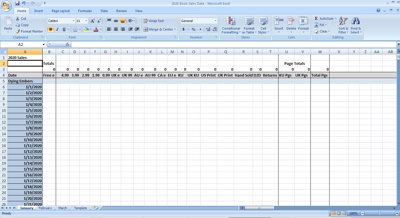 Any time I see any sales activity, I plug it into Book Sales Data. That one has tabs for each month and on each tab, it has each book and each book has a column of dates. It also has columns for the price it sold at and where (country-wise), pages read, etc. So, if I sell a book today, I'd type a one in say the Dying Embers section in the $3.99 column. Or if someone in the UK read 100 pages of Wish in One Hand, I'd put 100 in the KU UK section (which could then feed a formula in another column to give me the percent of book read).