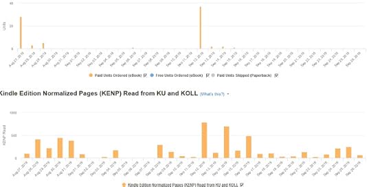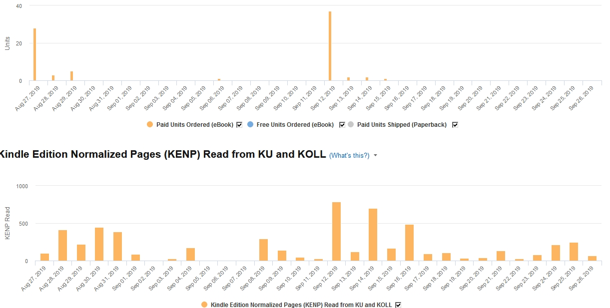 If you haven't seen one of these, the top graph is the quantity of whole books sold and the bottom is pages read through the Kindle Unlimited program. The spikes you see in the first graph directly correlate to paid advertising. There's a little residual sale activity after the ad, but beyond that, crickets in the whole book sales area.