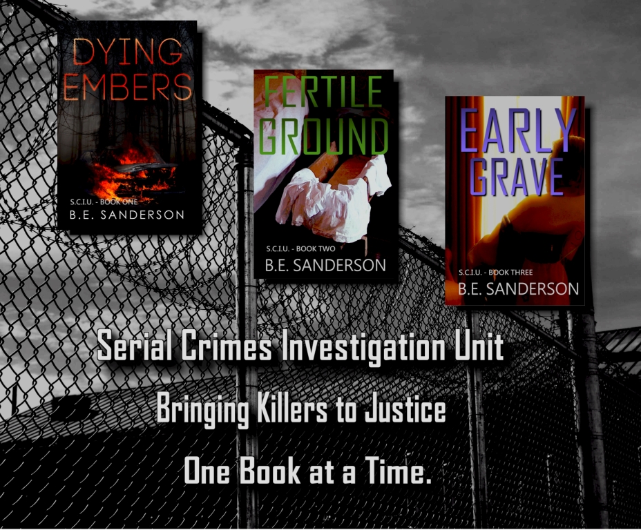 I think it still needs some tweaking. The white 'Bringing Killers to Justice One Book at a Time' on the gray background might have been on the no-no list. When I made it, it looked pretty good, but seeing it now, it's kind of hard to read at this size. Might need to outline those words like I did with the SCIU words.Still, I think it carries the message I wanted and it's not too busy (which was another of the marketing no-nos). You can tell that's a prison fence, right? Yeah, not all the villains in the series make it to behind the fence, but I was trying to find one image to convey a theme for all three books and nothing says 'justice' like a prison.