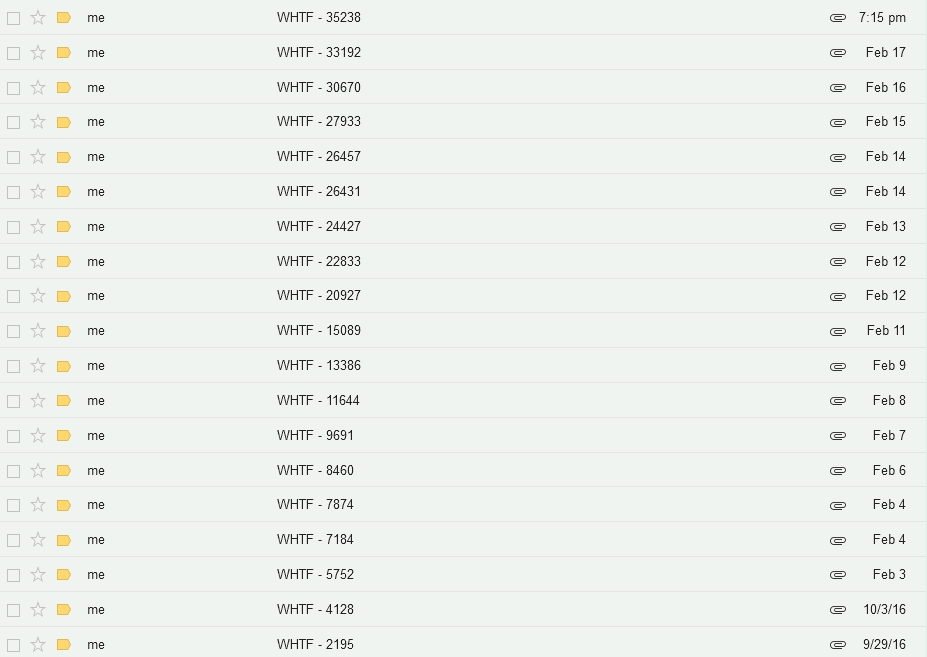 Screenshot from my email where I've mailed the file to myself every night.So, you can see the progression on WHTF (Wish Hits the Fan). I started out the month with the 4128 words I'd left off on back in October '16, which I'd started back in September. I sat down on February 3rd - which was when I'd finally decided what book I was going to work on - and was off to the races.