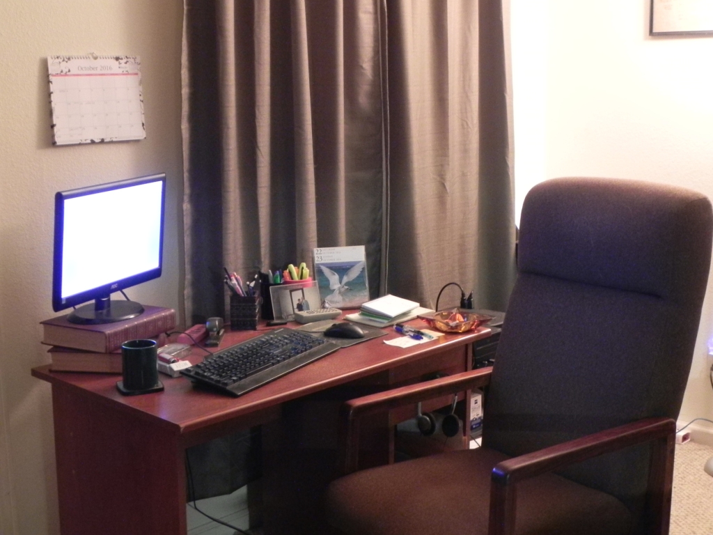 So, there I am - laid out in workspace style. You see my coffee mug. You see my pack of smokes and my ashtray. You see the myriad of writing utensils - one cup for pens and pencils, one for markers, and the last for highlighters. Two calendars - the plain one on the wall for keeping track of things and my bird of the day calendar in the corner. (Today's bird is the White Tern.) There's also a photo of my mom and dad. The remote goes to my little stereo, but I rarely listen to that. If you look closely, you'll find my headphones hanging from the drawer knob. Better to listen to tunes without disturbing the Hubs. The two books under my monitor are old Funk & Wagnalls dictionaries (A-L and M-Z). The corner of the frame you can see in the upper right is a copy of The Declaration of Independence. For the record, those drapes are never opened. And the window behind them leads to another room. (I didn't design this place, so no clue why there's a window looking out on the sun room, but no windows looking outside.)