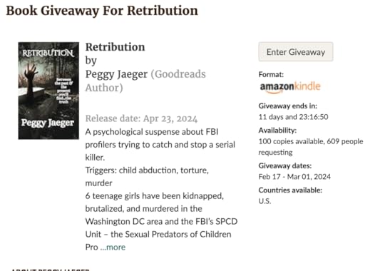 Just a reminder, kids, that my GOODREADS GIVE AWAY for a FREE Kindle copy of RETRIBUTION ends tomorrow, March 1. If you haven’t entered yet, now would be the perfect time to do so.