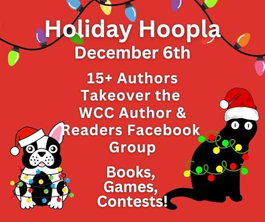 Just like the graphic says, I’ll be one of many authors participating in this year’s HOLIDAY HOOPLA over on the WCC AUTHOR AND READERS FACEBOOK GROUP