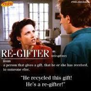 And speaking of holidays, have you ever Re-gifted? Or ever been accused of being a re-gifter? Thank Elaine for that one.