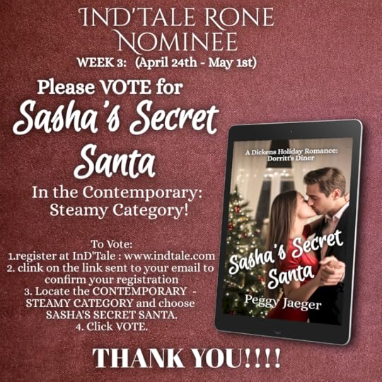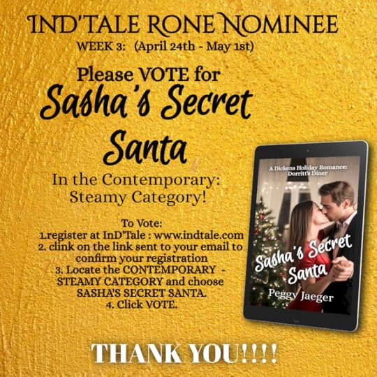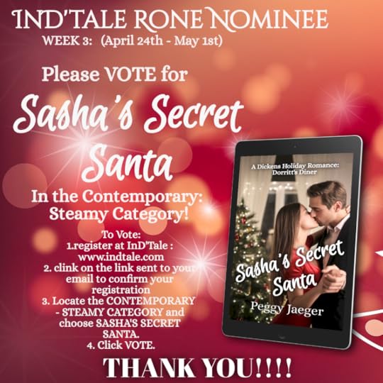 SIGN IN to your IND’TALE ACCOUNT or Register at InD’tale magazine: www.indtale.com if you don’t have one. They will send you an email to confirm your registration. Click on that!Go to the drop-down that says RONES/CONTESTS in the upper right corner of the main page.A graphic will pop up with all the nominees. Locate the CONTEMPORARY STEAMY Category in WEEK 3 APRIL 24- MAY 1 and find SASHA’S SECRET SANTA by PEGGY JAEGERclick VOTE next to it and submit.You’re done!!!!