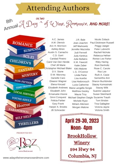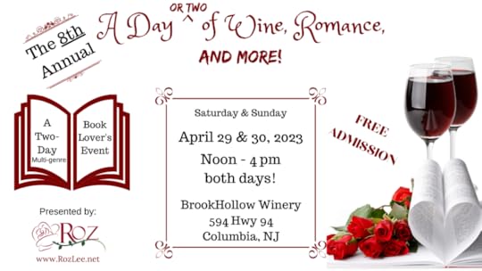 I’ll be there both days!!! Come out and find some new romance authors to read, have some wine, bring some friends!! This promises to be a FUNFUNFUN event put on by the fabulous Roz Lee