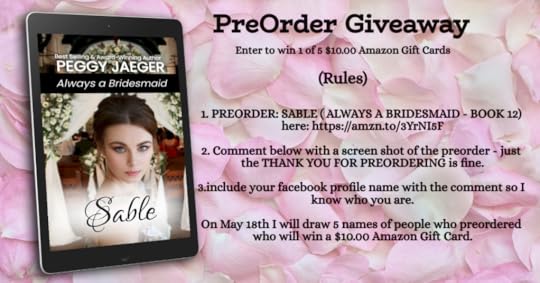 And if you like CHANCE and want to read his sister, SABLE’s, story, I’m having a giveaway if you preorder and let me know you have done so. I’m giving away $10.00 Amazon GCs to 5 people who’ve preordered before the release day of May 17th. Rules are in the following graphic!