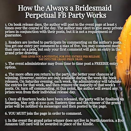 Today kicks of the ALWAYS A BRIDESMAID series and with it, a brand new PERPETUAL FB PARTY. You have to join the Facebook party page here: AABFB to participate.