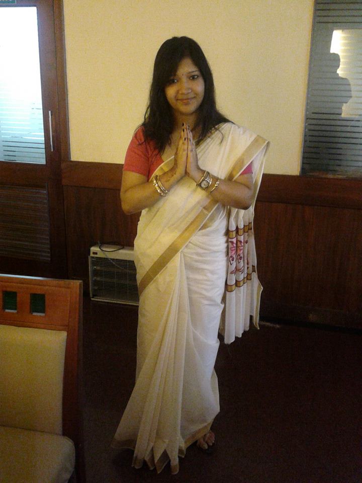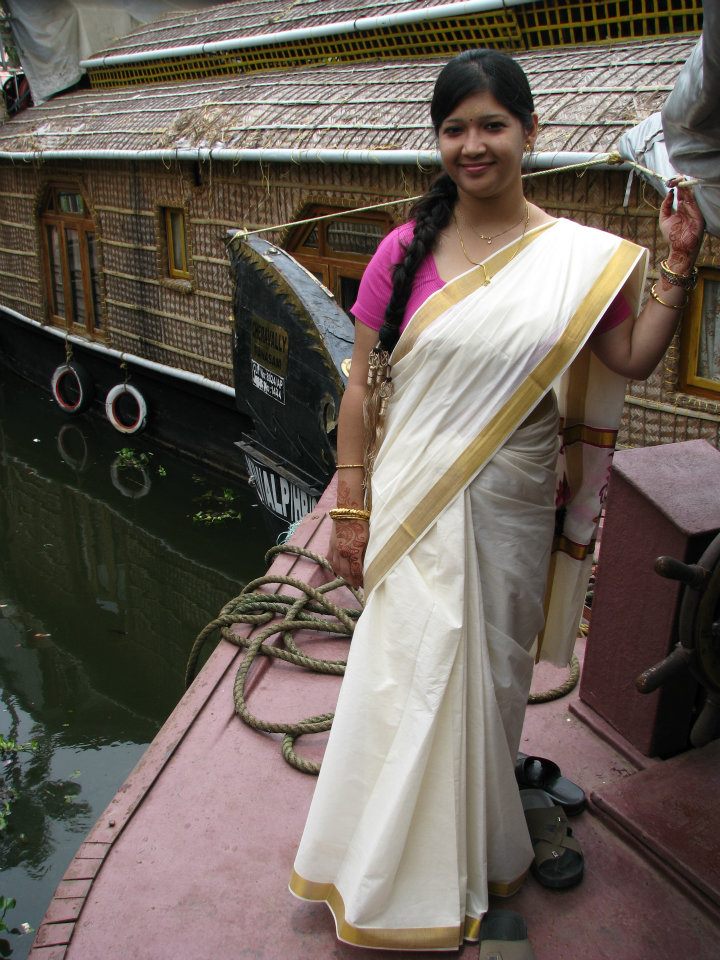 We were visiting Kerala once when my cousin sister was getting married there. A day after the wedding the newly-wed couple had thrown a houseboat party. I am always fascinated with the Malayalam food, their culture and their simplicity. The ladies wear these beautiful white and gold cotton sarees which are so typical of the place! I had bought one with pink embroidery. I wanted to dress up like a Malayali woman for the houseboat party.