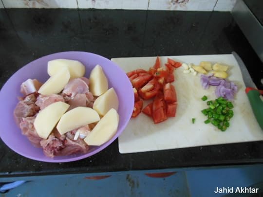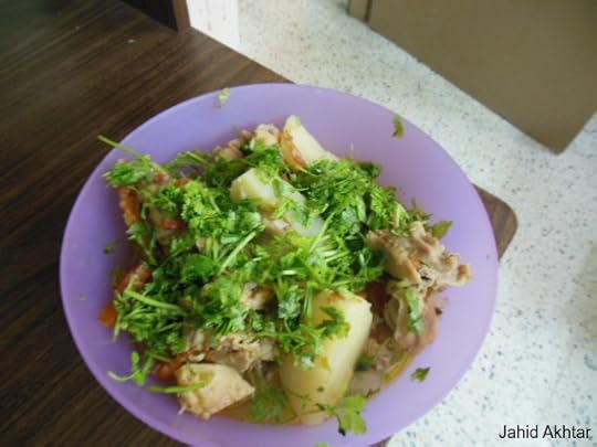 Ingredients:1/2 kg chicken1 large onion2 big potatoes2 tomatoesSome GarlicFew pieces of GingerChopped green chiliesSalt to tasteChopped coriander for garnish