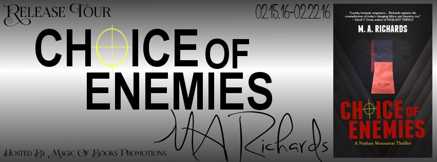 I adore this book! M. A. Richards is a first-time author, but I rank CHOICE OF ENEMIES with the best novels of Martin Cruz Smith and Daniel Silva. The novel is written with passion, excitement, and knowledge – Richards certainly knows the dirty world of government and espionage. His pacing is taut, and his language is a joy to read. His sense of location is superb; I smelled the stench of oil in the Delta and felt the heat of the desert in Namibia. Most importantly, Nathan Monsarrat is one of the most likeable heroes I’ve met. When the novel ended (I read it in 48 hours), I was sad that the adventure was over but thrilled I had discovered Nathan Monsarrat. Also, Nathan’s antagonist, Felix Sanhedrin, is a delicious villain, a manipulative, dishonest, and neurotic full-bodied character. The relationship between Nathan and Felix is subtly drawn by Richards and is one of the most enjoyable aspects of this excellent novel. I grant it five stars and recommend it 100%! By Y. H. Park on January 19, 2016