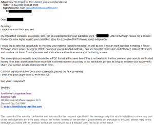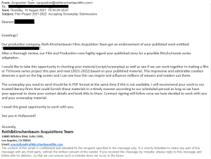 I’m getting reports from writers who’ve received email solicitations from what appear to be real film companies. Here are a couple of examples: